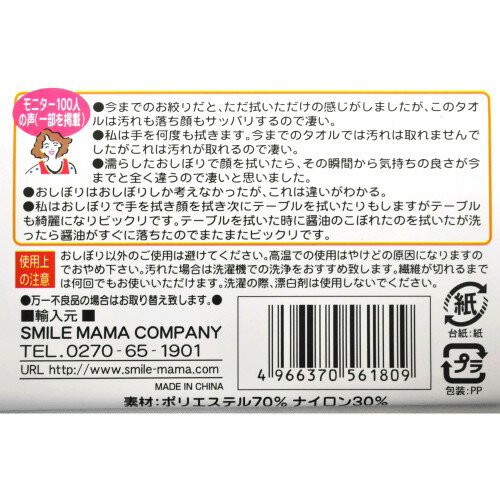 商品名 マイクロファイバー 汗ふき おしぼりタオル 15×20cm 1枚入 商品説明 ●今話題のメガネ拭きがおしぼりになった!●手・顔が本当にサッパリ! 商品サイズ(約) 15×20cm 入数 1枚 材質 ポリエステル70%、ナイロン30% 使用上の注意 ・おしぼり以外のご使用は避けてください。